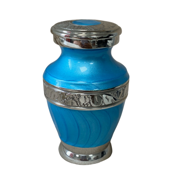Solid Brass urn with a faux texture Bahama Blue enamel high polish finish. Detailed silver etched band tapered body. Felted base and threaded lid opening